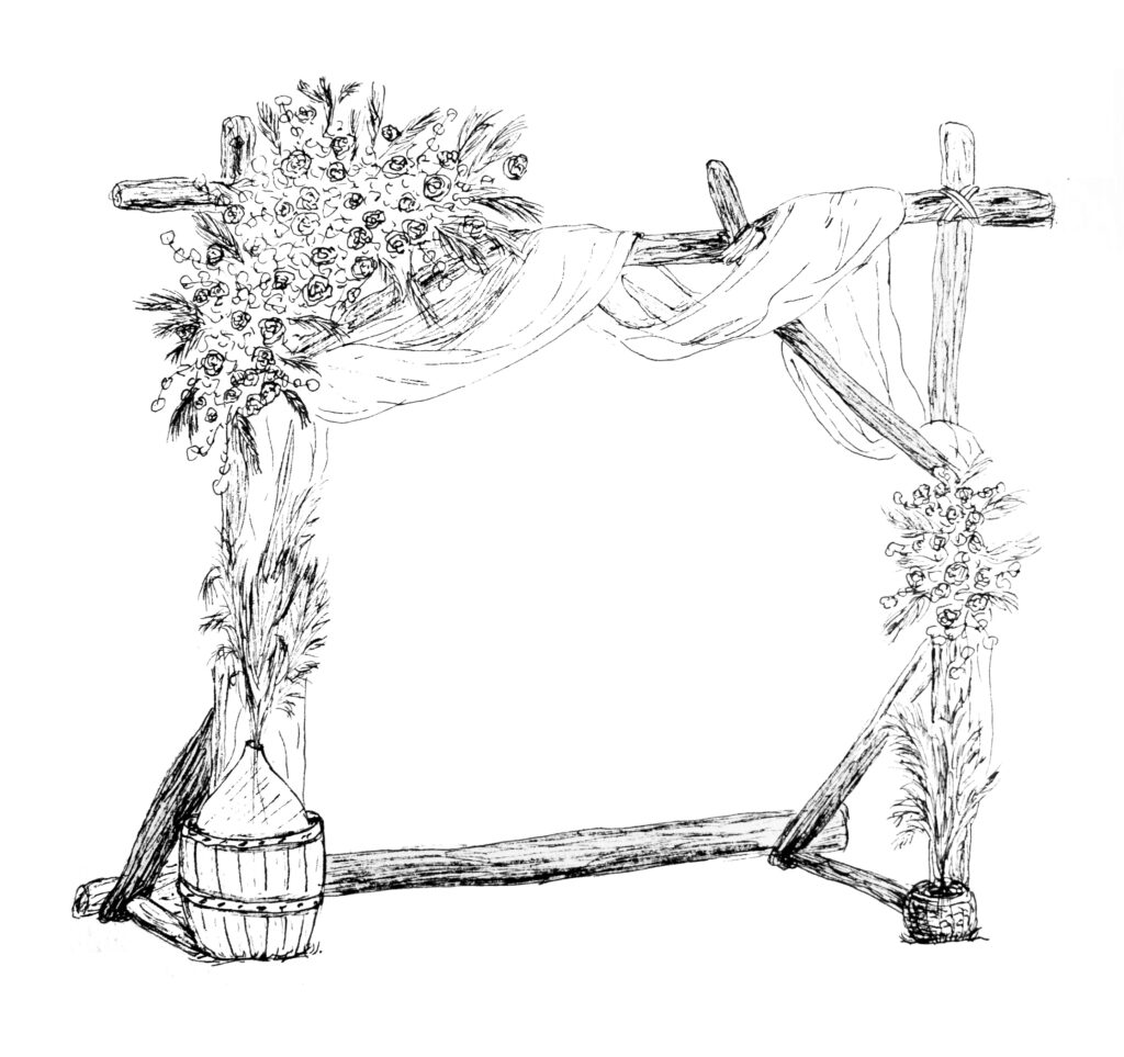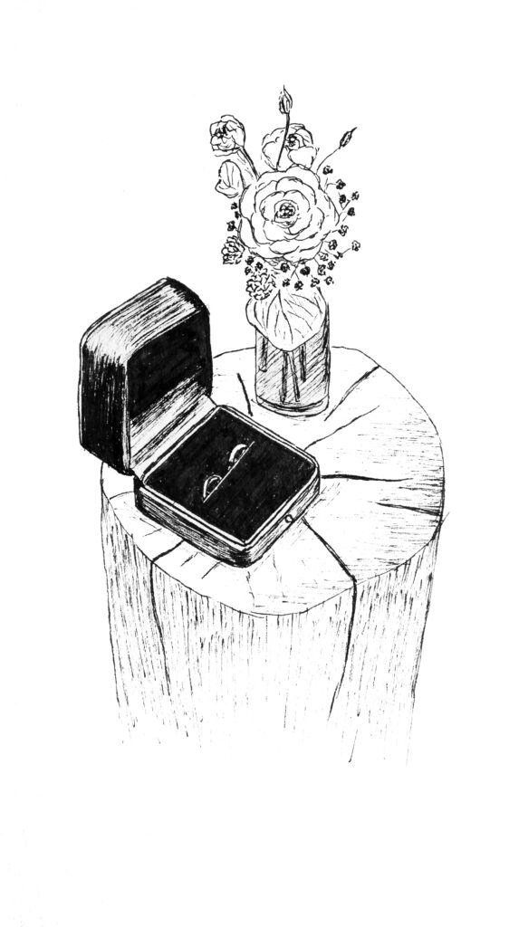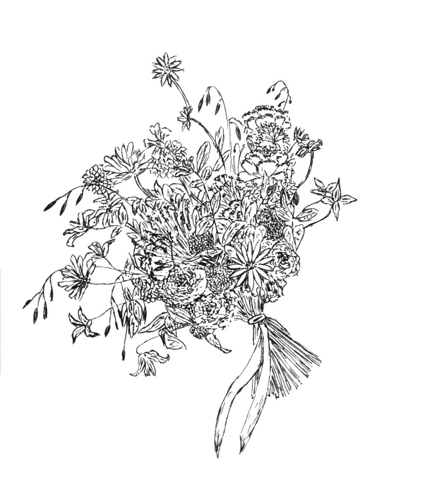 Je dessine divers éléments de votre mariage dont toujours le bouquet et le lieu de cérémonie ou réception. En plus de ça, j’y ajoute certains détails de votre journée, la décoration florale, les meubles anciens, des éléments de décorations, mon imagination n’a pas de limite !